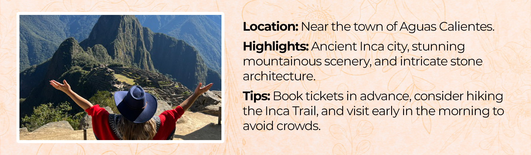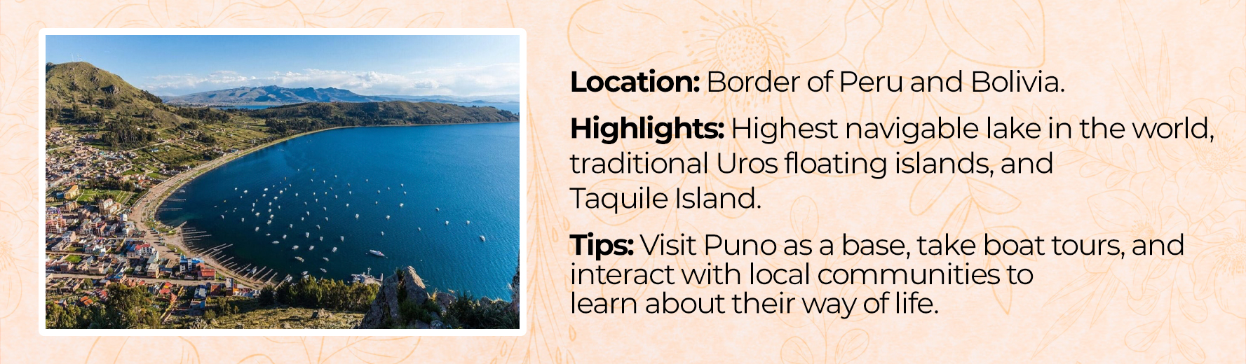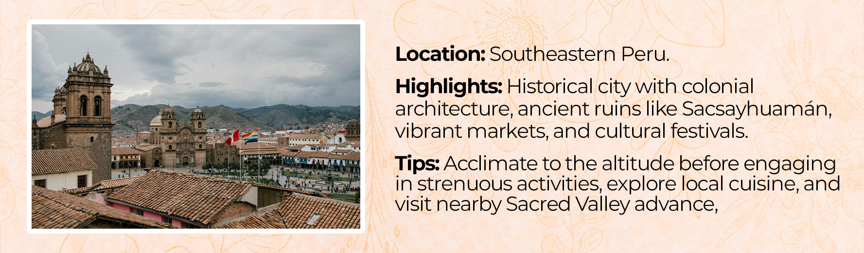 Spanish is the official language, though many locals speak Quechua and other Indigenous languages. Basic Spanish phrases can be very helpful.
