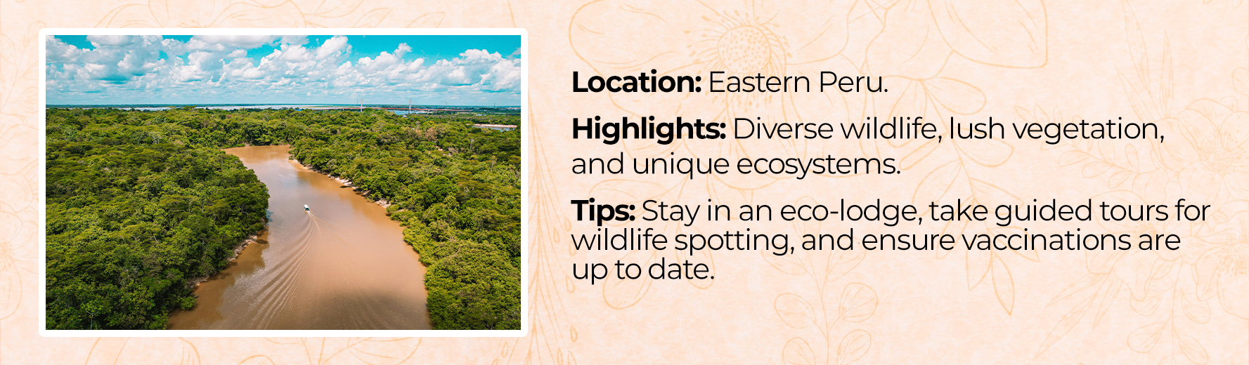 Stay hydrated, acclimatize to high altitudes, and take precautions against mosquito-borne illnesses in the Amazon.