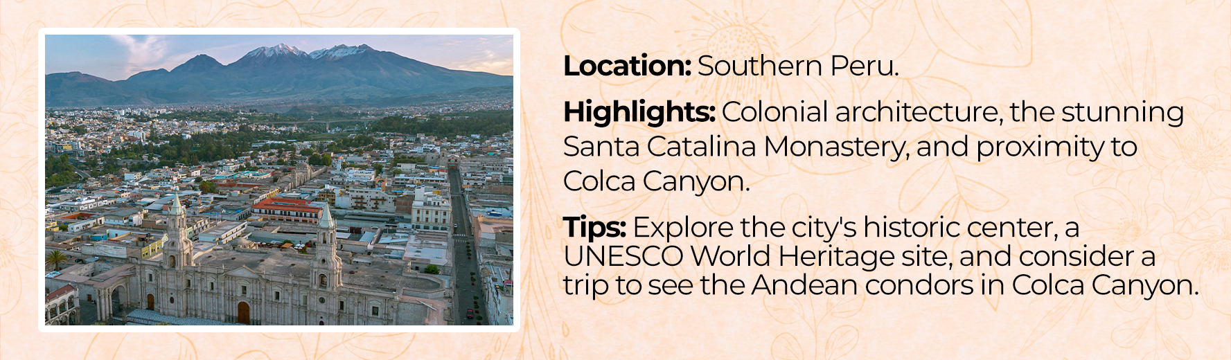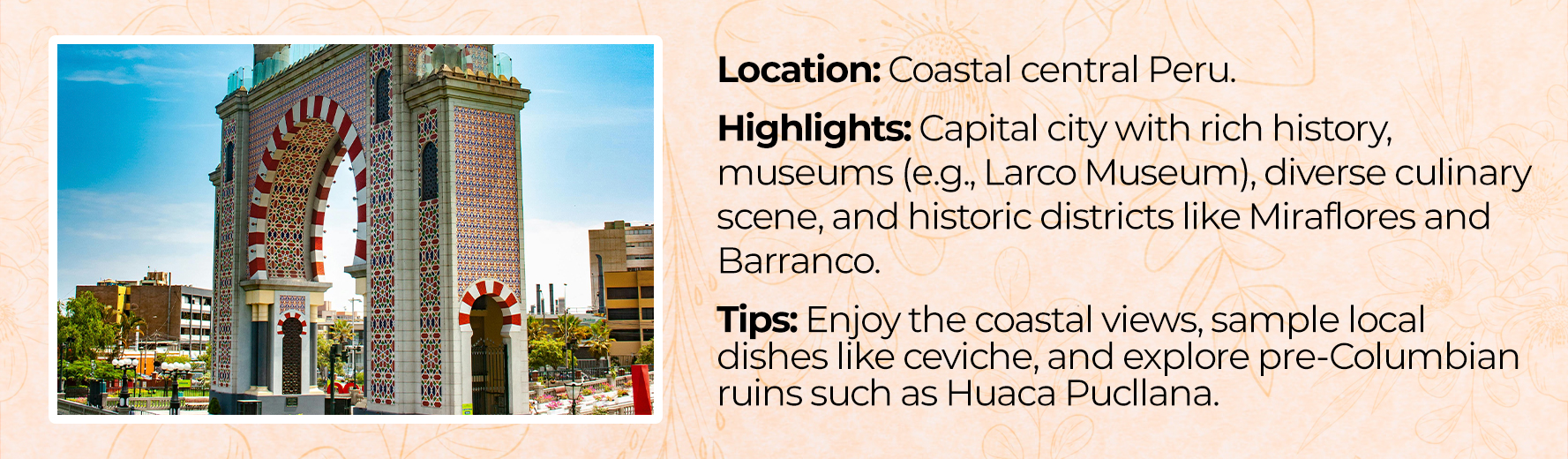 Peru, officially the Republic of Peru, is a country in South America, bordered by Ecuador and Colombia to the north, Brazil to the east, Bolivia to the southeast, Chile to the south, and the Pacific Ocean to the west. Its capital is Lima. Peru is known for its rich cultural heritage, blending Indigenous, Spanish, and African influences. The country has a diverse geography, ranging from the arid plains of the Pacific coast to the peaks of the Andes mountains and the tropical Amazon rainforest.